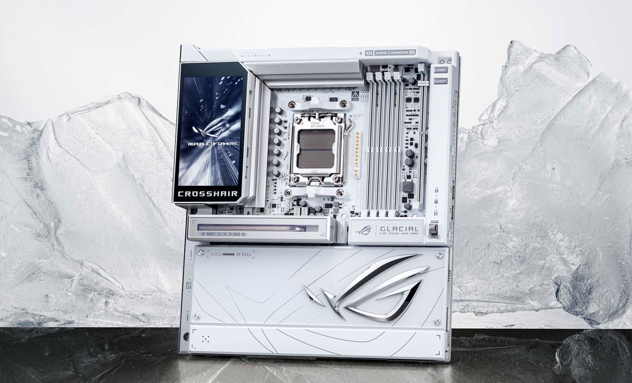 ROG의 새로운 플래그십 모델인 ROG Crosshair X870E Glacial은 극한의 성능과 확장성은 물론, 독보적인 비주얼을 갖춘 제품이다. 실버와 화이트 컬러 조합으로 시스템 내부가 노출되는 PC 빌드를 고려하였으며, I/O 쉴드에 5인치 풀컬러 LCD 스크린을 탑재하여 시스템 정보를 확인하거나 사용자 맞춤 이미지를 출력할 수 있다. 또한 LN2 모드를 포함한 익스트림 OC 키트를 제공해 극한의 오버클럭킹이 가능하다.