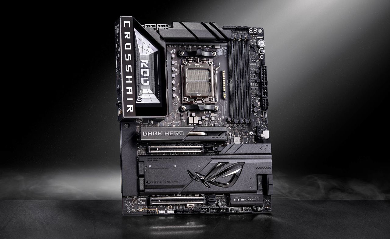 ROG Crosshair X870E Dark Hero는 블랙 컬러를 베이스로 높은 완성도를 보여주는 게이밍 메인보드로, 20+2+2 전원부와 대형 히트싱크 설계를 통해 고성능 게이밍 시스템에 최적화된 완성도를 보여준다. I/O 쉴드에는 Polymo Lighting II가 적용되어 ROG 로고와 함께 다이나믹한 RGB 조명 효과를 선사한다.