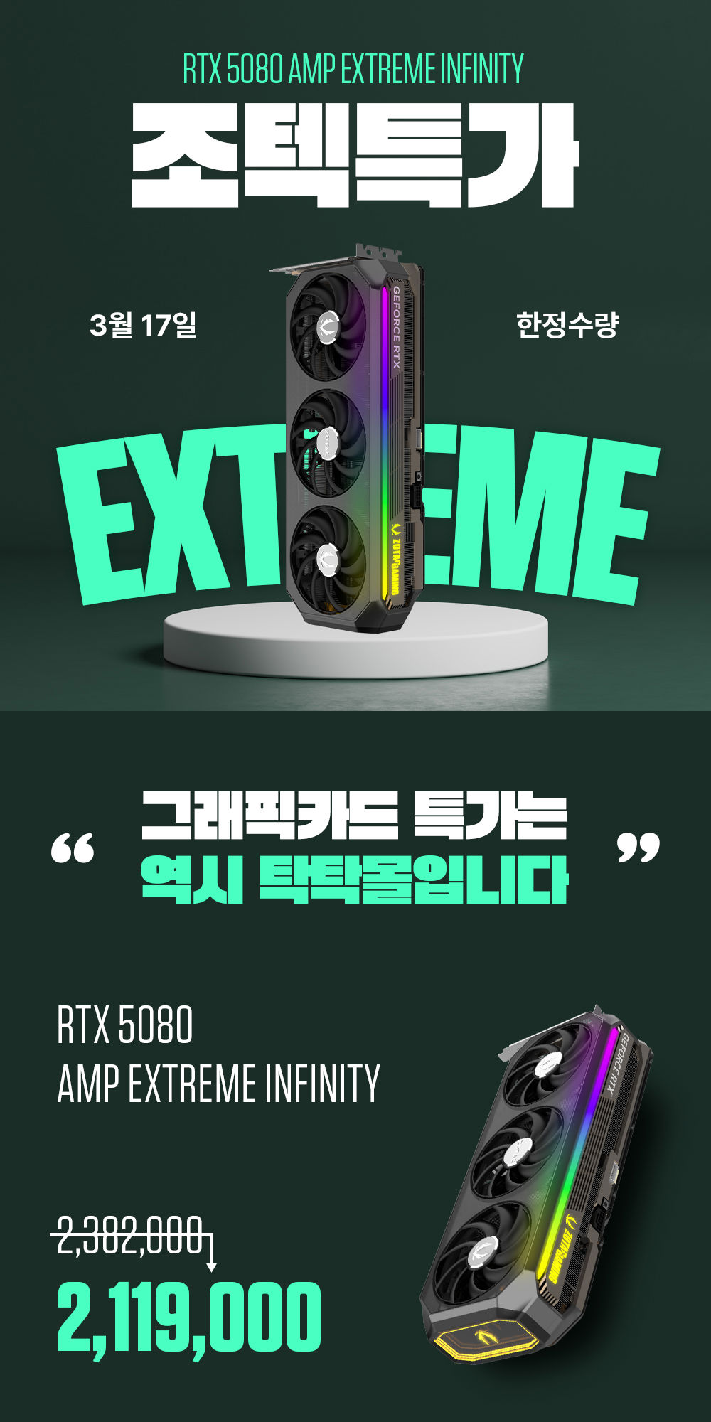 조텍의 그래픽카드 특가는 조텍 공식 쇼핑몰 탁탁몰에서 3월 17일부터 3월 19일 혹은 수량 소진 시까지 진행된다. 본 특가에서는 'ZOTAC GAMING GeForce RTX 5080 AMP Extreme Infinity'를 2,382,000원에서 263,000원이 할인된 2,119,000원에 만나볼 수 있다.