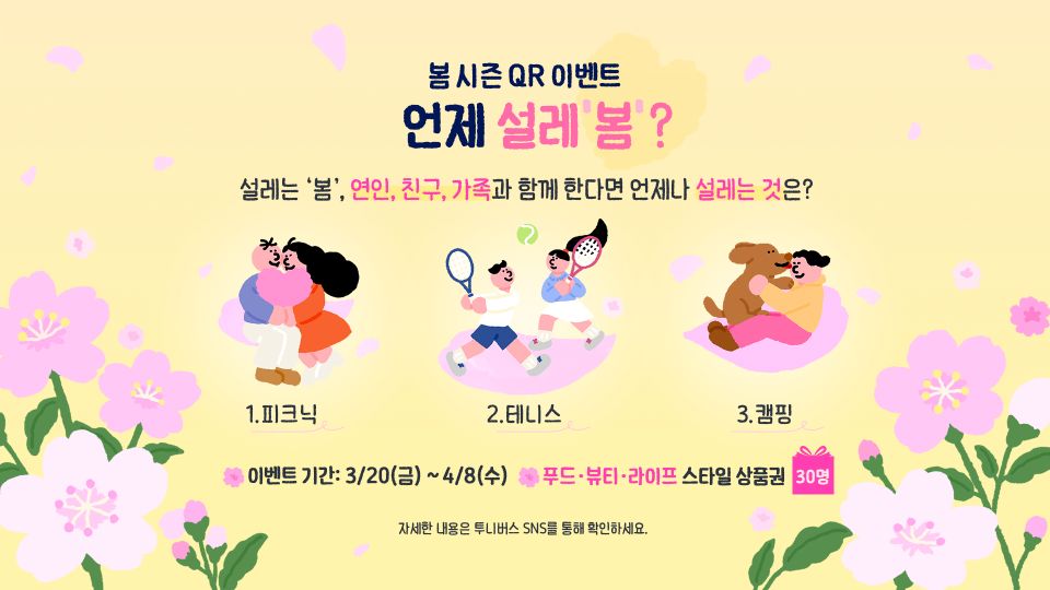 투니버스는 봄 시즌 ID 공개와 함께 시청자 참여형 '봄 시즌 QR 이벤트_언제 설레봄?'도 함께 진행한다. 이번 이벤트는 '설레는 봄, 연인, 친구, 가족과 함께 한다면 언제나 설레는 것'을 주제로 진행되며, 방송 화면에 노출되는 QR 코드를 스마트폰으로 스캔해 실시간으로 참여할 수 있다. 이벤트 기간은 오는 20일(금)부터 4월 8일(수)까지 진행되며, 참여자 중 추첨을 통해 소중한 사람과 함께 즐길 수 있는 베이커리, 뷰티&헬스, 배달앱 상품권을 추첨을 통해 증정한다. 당첨자는 개별 통지한다.