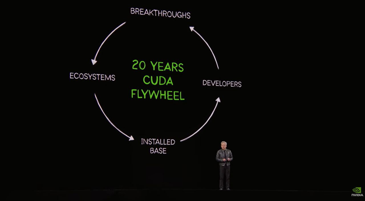 젠슨 황 CEO는 쿠다(CUDA) 출시의 20주년을 기념하고, 이를 가속 컴퓨팅을 이끄는 '플라이휠(flywheel)'이자 AI 라이프사이클의 모든 단계를 지원하는 플랫폼이라고 설명했다.