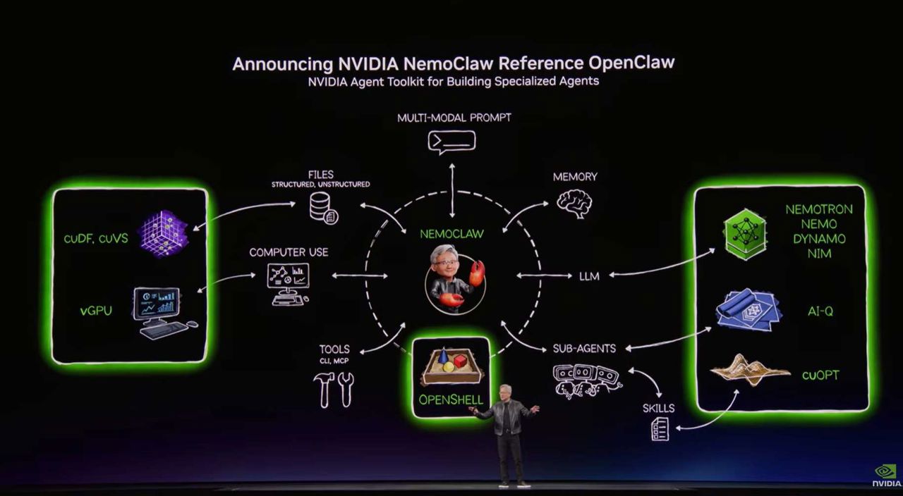 이 기술이 기업 내부에서 안전하게 배포될 수 있도록 보장하기 위해, 정책 적용, 네트워크 안전 장치, 프라이버시 라우팅을 결합한 엔비디아 오픈쉘(OpenShell) 런타임과 엔비디아 네모클로(NemoClaw) 스택을 소개했다. 그는 이러한 기술들이 '전 세계 모든 SaaS 기업의 정책 엔진' 역할을 할 수 있다고 말했다.
