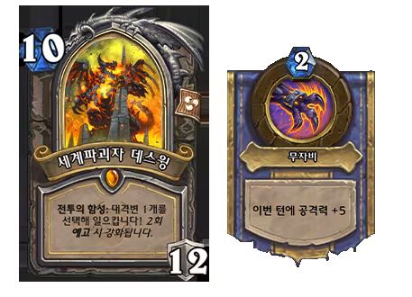 대격변에서는 새로운 영웅 카드 '세계파괴자 데스윙'을 비롯해 신규 키워드 '예고'와 '산산조각', 돌아오는 키워드 '거수' 및 용군단 카드를 포함한 총 135종의 신규 카드를 만나볼 수 있다.