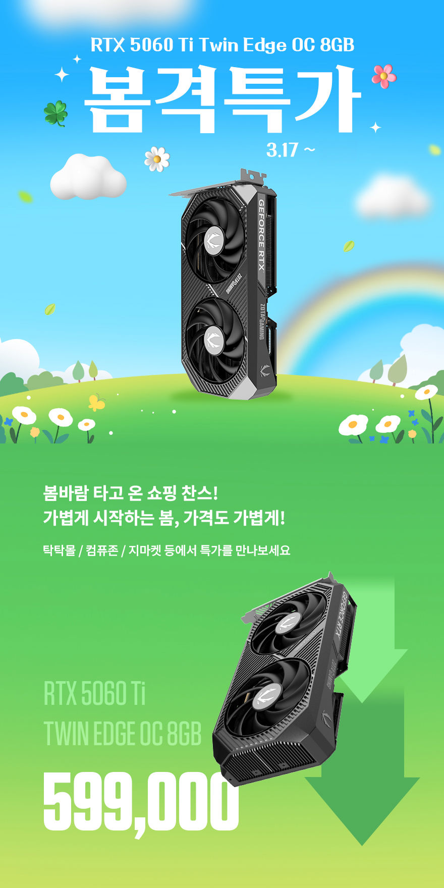 조텍의 그래픽카드 특가는 조텍 공식 쇼핑몰 탁탁몰과 PC 쇼핑몰과 오픈 마켓 등에서 만나볼수 있으며, 3월 17일부터 수량 소진 시까지 진행된다. 본 특가에서는 'ZOTAC GAMING GeForce RTX 5060 Ti Twin Edge OC 8GB'를 599,000원에 만나볼 수 있다.