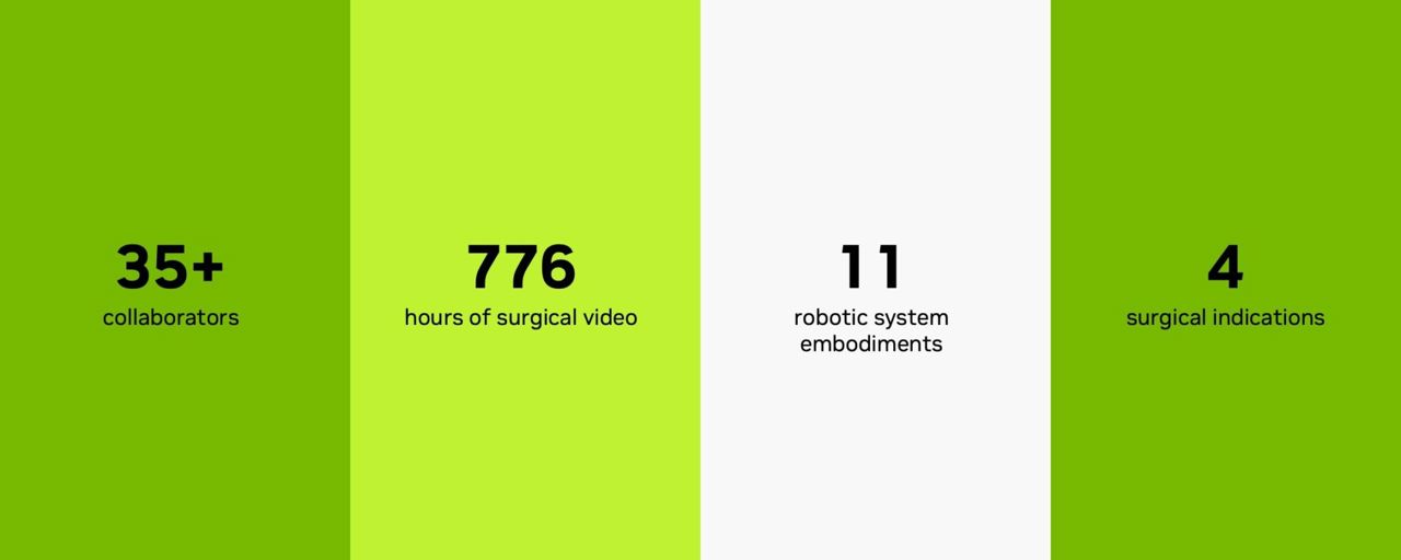 l 오픈-H(Open-H): 세계 최대 규모의 헬스케어 로보틱스 데이터셋이다. 약 30개의 협력 기관과 함께 구축된 오픈-H는 수술 절차의 실제 다양성과 복잡성을 반영하며, 700시간 이상의 수술 영상을 제공해 첨단 범용 로봇 시스템 개발을 가속화한다.