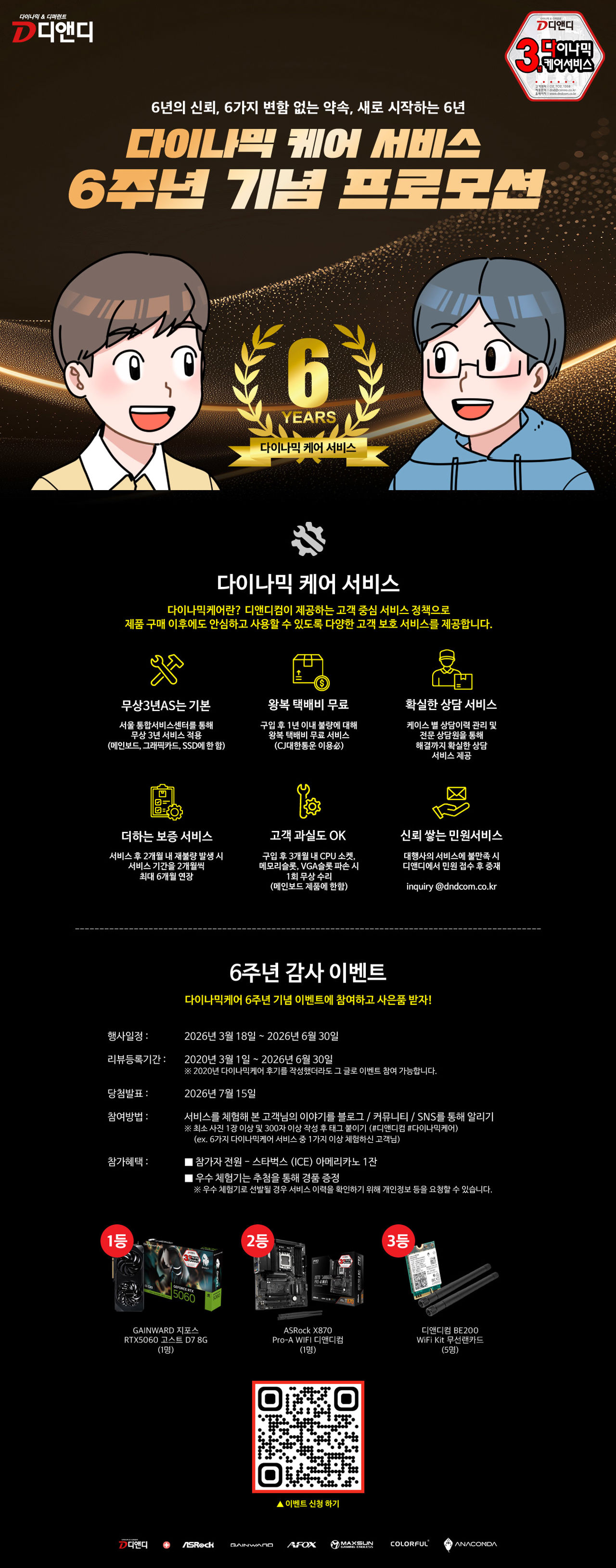 혁신적인 IT 하드웨어 솔루션을 제공하는 디앤디컴은, 디앤디컴이 공식 유통하는 애즈락(ASRock) 메인보드와 그래픽카드를 비롯하여 게인워드(Gainward), 맥선(Maxsun), 에이폭스(AFox)의 그래픽카드 및 컬러풀(Colorful) SSD에 대해 혁신적인 6가지 고객서비스 프로그램인 '다이나믹 케어'의 6주년 기념 프로모션을 진행한다고 밝혔다.