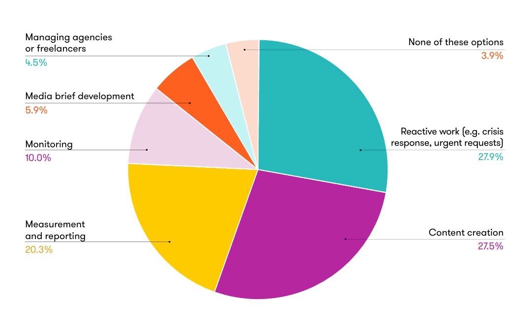 PR 전문가들이 가장 많은 시간을 소비하는 업무는 긴급 대응 등 반응형 업무(27.9%), 콘텐츠 제작(27.5%), 성과 측정 및 리포팅(20.3%)으로 조사됐다. 이는 AI가 일부 콘텐츠 생산을 대체하고 있음에도 불구하고, PR 조직이 여전히 다양한 역할을 동시에 수행하는 복합적 기능 조직임을 보여준다.