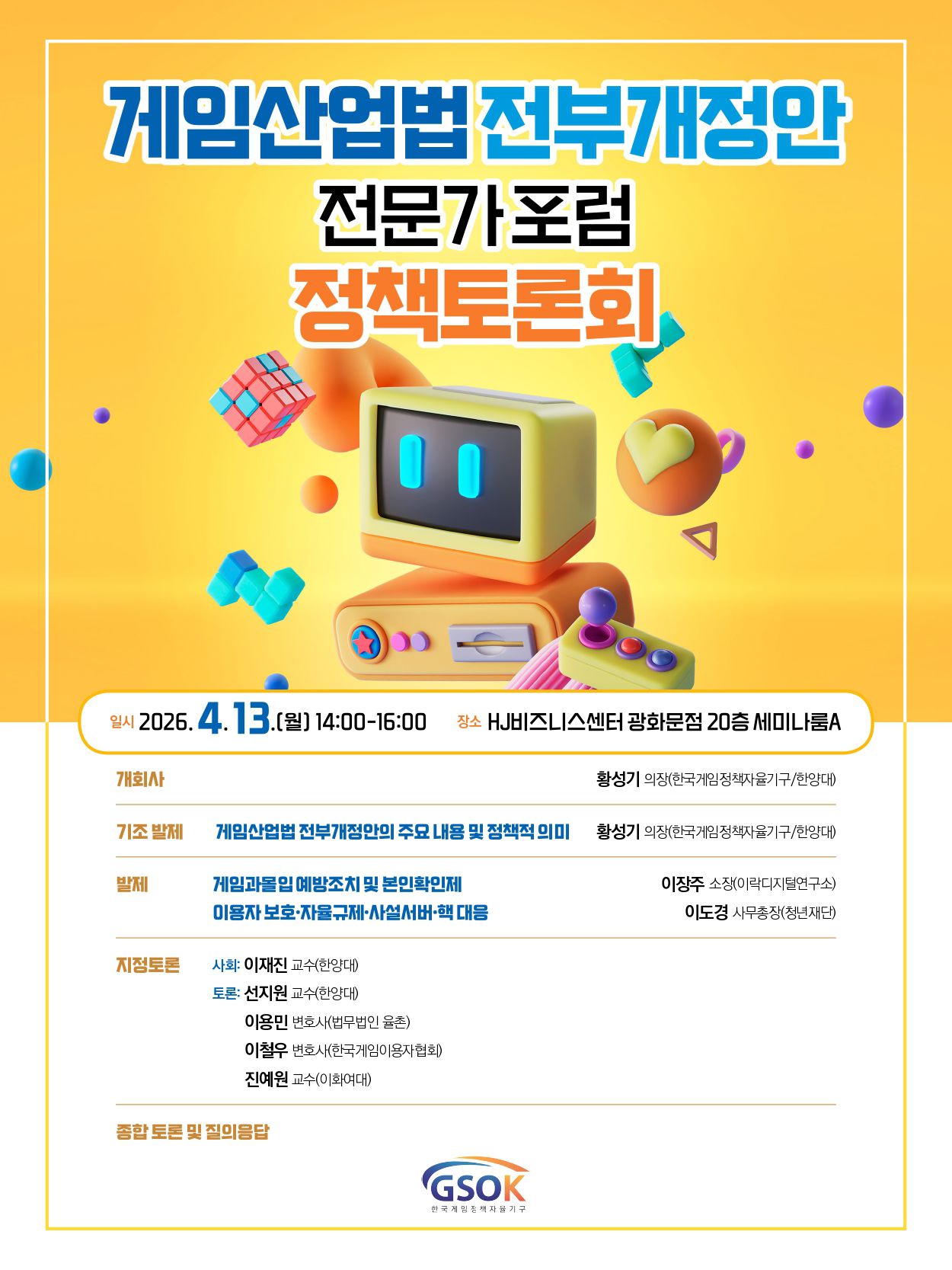 이와 함께 오는 4월 13일(월), HJ비즈니스센터에서 게임산업법 전부개정안 전문가포럼 정책토론회를 개최하여 전부개정안의 주요 쟁점에 대한 전문가의 의견을 공유하고 각계의 다양한 의견을 수렴할 예정이다.