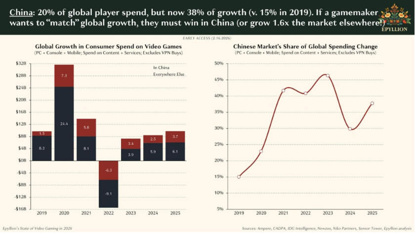저명한 분석가 매튜 볼은 최근 보고서에서 냉혹한 현실을 제시했다. 중국 시장을 제외하고 인플레이션 요소를 고려하면 2021년 이후 전 세계 게임 시장 규모는 약 1.8% 축소됐다. 중국 플레이어들의 수입 게임 지출은 매년 5% 감소하고 있으며, 해외 게임은 현재 중국 플레이어 총 지출의 20%만을 차지한다.