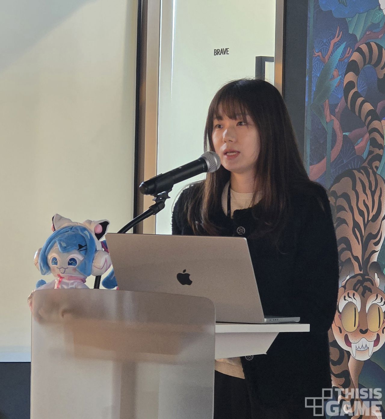 ▲ <쿠키런: 오븐스매시> 고지희 개발 PM입니다. 책상 왼쪽에 있는 이번 게임의 마스코트 캐릭터 'DJ 미야' 인형도 기억해주세요.