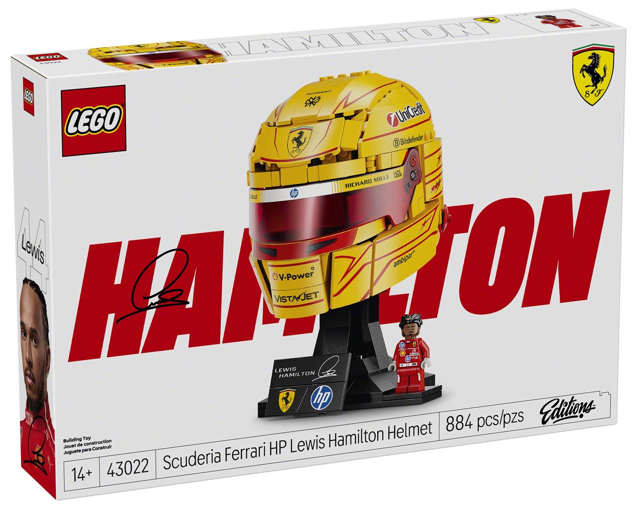 '레고 에디션 스쿠데리아 페라리 HP 루이스 해밀턴 헬멧(43022)'은 884개의 브릭으로 루이스 해밀턴이 지난해 페라리로 이적한 후 처음 착용한 '모데나 옐로우' 색상의 헬멧을 재현한 제품이다. 루이스 해밀턴의 고유한 드라이버 번호 '44'와 7번의 월드 챔피언을 상징하는 7개의 별을 충실하게 구현했다.