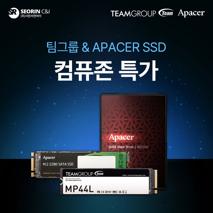 컴퓨터 관련 주요 부품 수입 유통 전문 업체 서린씨앤아이가 PC 전문 쇼핑몰 컴퓨존(Compuzone)과 함께 진행 중인 글로벌 스토리지 브랜드 팀그룹(TeamGroup)과 어페이서(Apacer) SSD 단독 특가 프로모션의 잔여 수량 판매를 이어간다고 밝혔다.