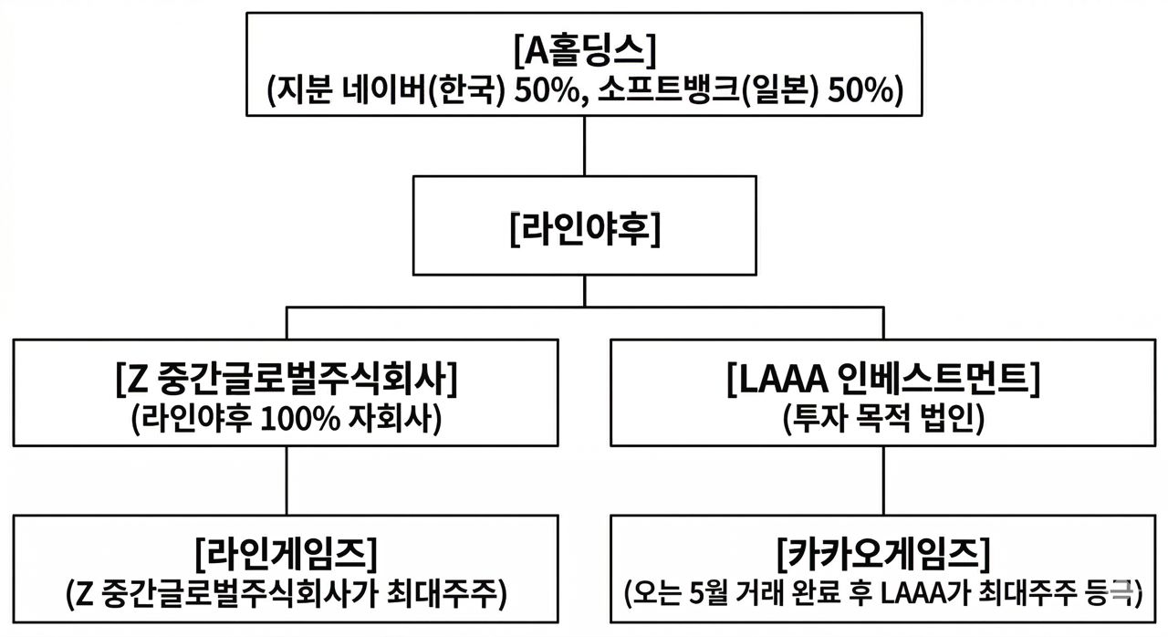 한국의 네이버와 일본의 소프트뱅크가 각각 50% 지분을 가진 A 홀딩스가 라인야후의 모회사로 자리 잡고 있다.