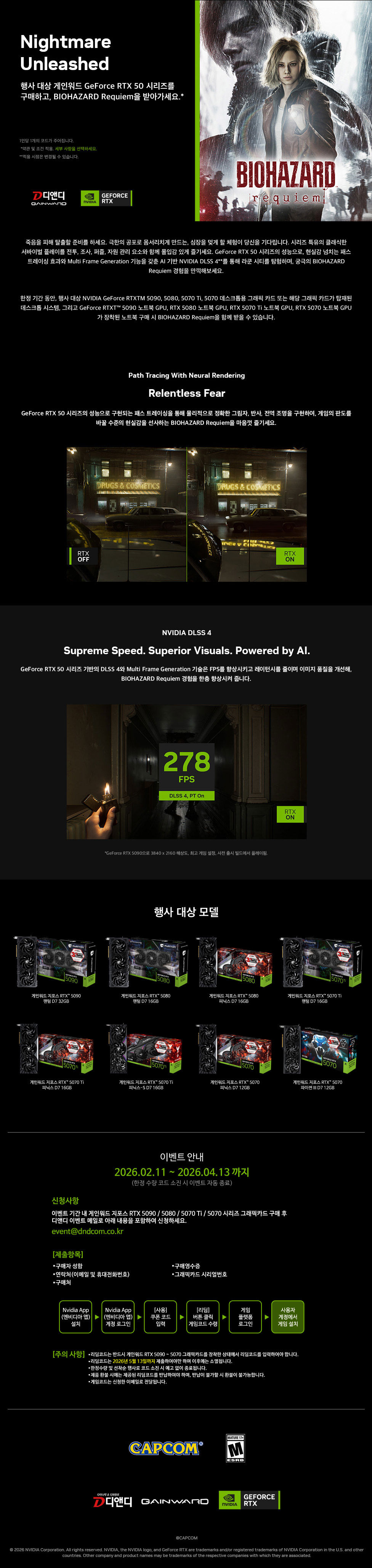 이번 게임 번들 프로모션의 참여 방법은, 게인워드 지포스 RTX 5070 이상의 그래픽카드 구매 후 디앤디컴 이벤트 메일(event@dndcom.co.kr)로 제품에 관한 정보 및 인적 사항을 등록하면 프로모션 진행 담당자가 확인 후, 고객에게 <바이오하자드 레퀴엠> 게임 코드를 이메일로 발송하며, 고객은 NVIDIA APP을 통해 리딤 코드를 등록하면 게임 등록 절차는 완료된다.