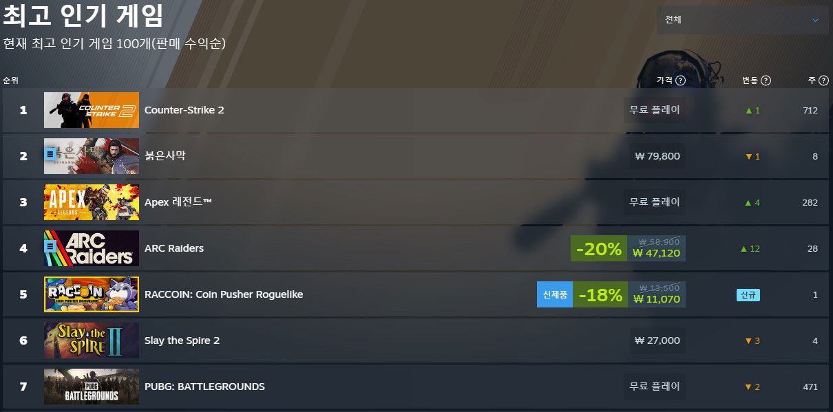 ▶ 스팀 글로벌 인기 게임 순위에서 유료 게임 중 1위를 차지한 <붉은사막>