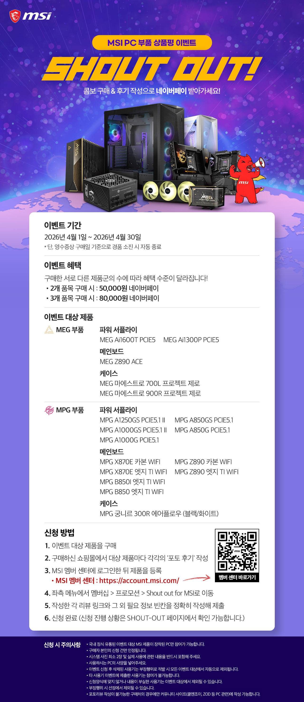 먼저 4월 30일(목)까지 진행되는 'Shout Out for MSI'는 MSI의 인기 메인보드, PC 케이스, 파워 서플라이를 구매하고 사용기를 작성한 고객에게 네이버 페이를 증정한다. 특히 서로 다른 제품군을 2개 구매 시 5만 원, 3개 구매 시 최대 8만 원의 혜택을 받을 수 있어 합리적인 구매가 가능하다.