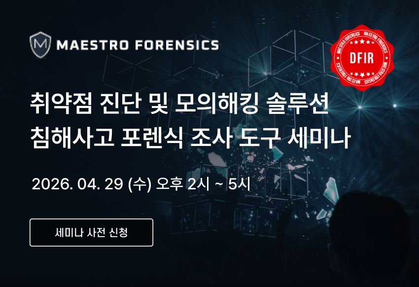 보안 전문업체인 마에스트로 포렌식은 오늘, 오는 4월 29일(수) 오후 2시부터 서울 독산동 인섹시큐리티 교육센터에서 '취약점 진단·모의해킹 솔루션 및 침해사고 포렌식 조사 도구 통합 세미나'를 개최한다고 밝혔다.