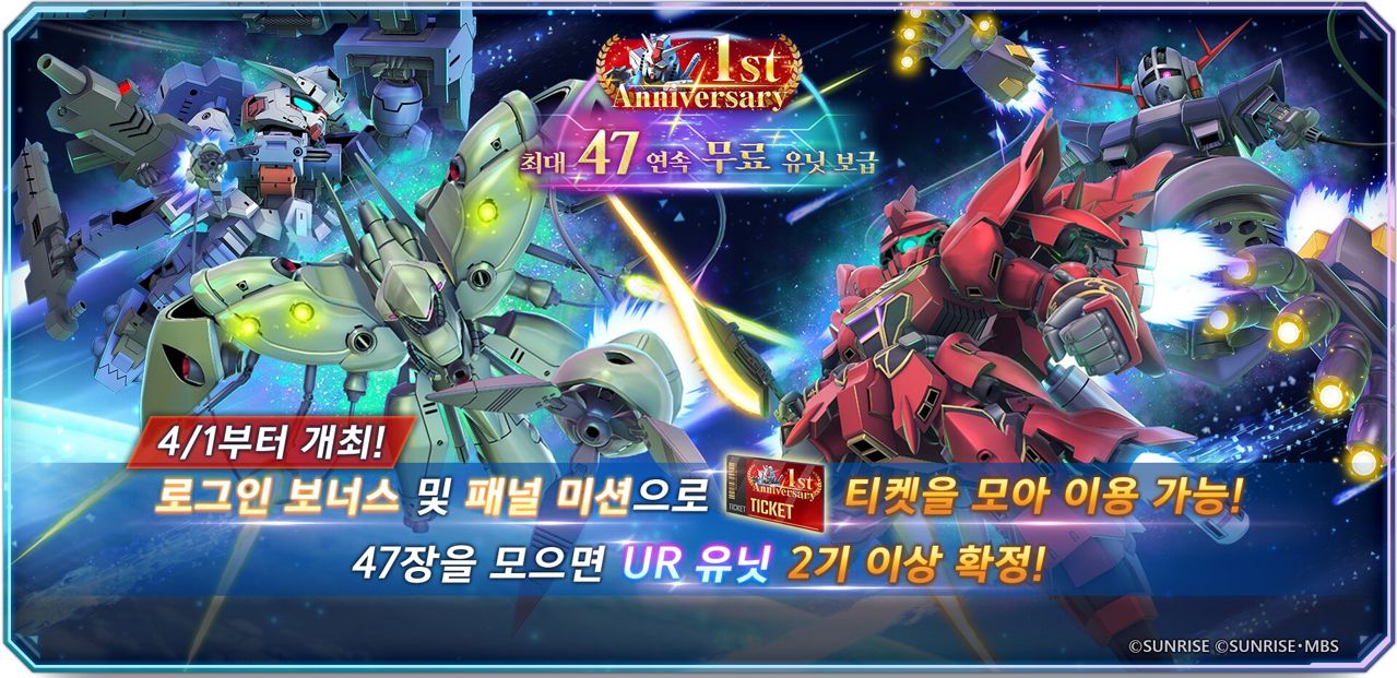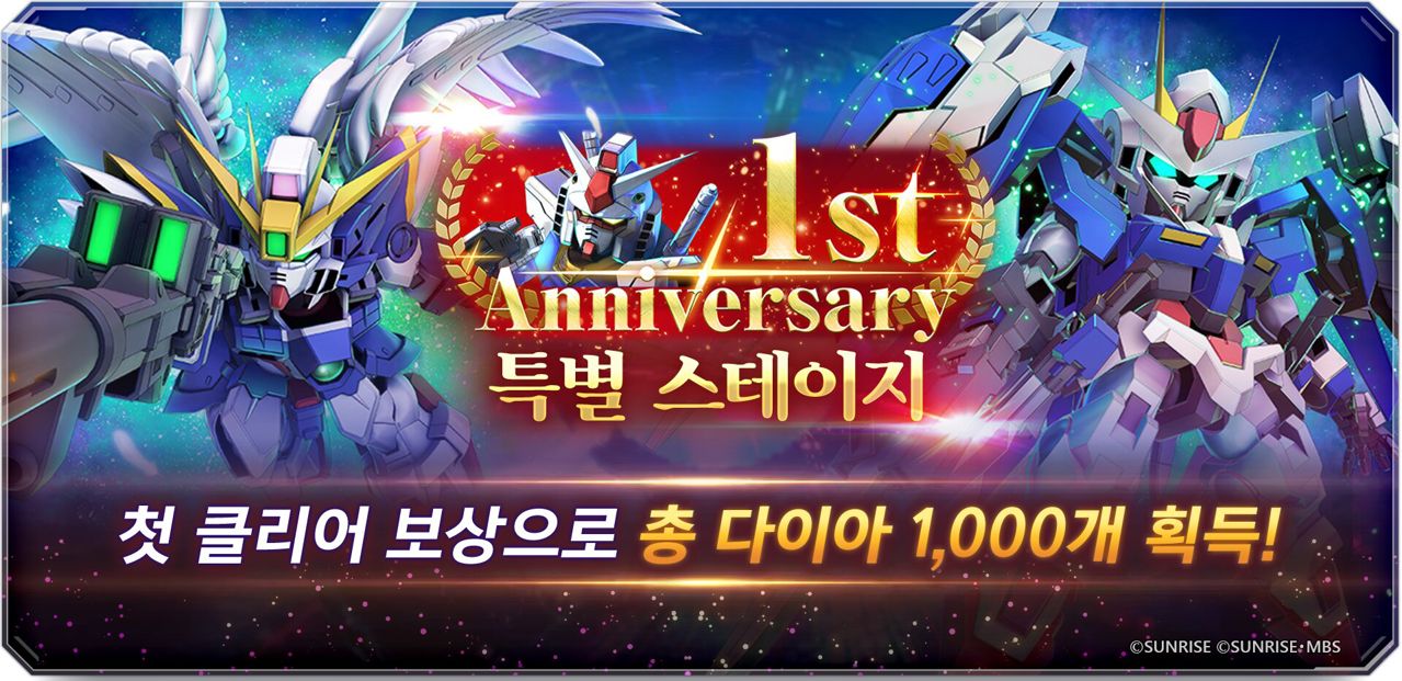 서비스 1주년을 기념한 다채로운 이벤트도 펼쳐진다. 먼저 '1st 애니버서리 특별 스테이지'가 오픈되어, 새롭게 등장한 UR '윙 건담 제로(EW판)(EX)'와 UR '더블오 라이저(최종결전사양)(EX)'를 미리 체험해 볼 수 있다. 스테이지 클리어 시 최대 1,000개의 다이아를 보상으로 획득할 수 있으며, 함께 진행되는 '1st 애니버서리 최대 47연 무료 뽑기'를 통해 UR 유닛 2체를 확정적으로 획득할 수 있는 파격적인 기회도 제공한다.