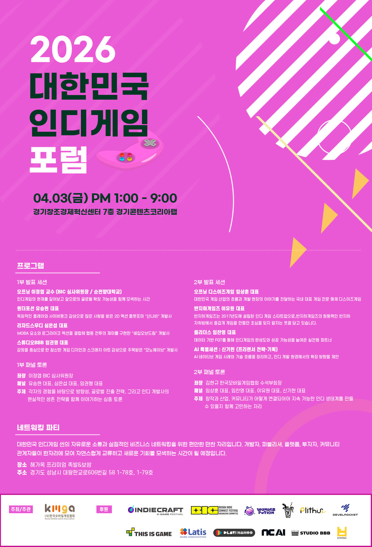 모든 강연 및 토론 일정이 종료된 후에는 참석자 간의 원활한 정보 교류와 소통을 위한 네트워킹 시간이 이어질 예정이다. 한국모바일게임협회 황성익 회장은 "이번 포럼을 통해 대한민국 중소게임산업과 인디게임 생태계가 한 단계 더 도약할 수 있는 계기가 되기를 바란다"며, "협회는 앞으로도 산업 발전을 위해 지속적으로 노력할 것"이라고 밝혔다.