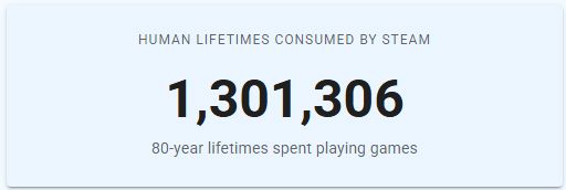 첫 지표부터 이 통계의 성격을 짐작할 수 있다. '스팀이 소비한 인간 수명'으로, 스팀 전체 누적 플레이 시간을 인간 평균 수명 80년으로 나눈 값이 총 130만 1,306명분에 달한다는 내용이다.