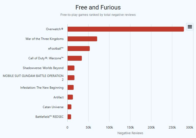 ▶ 부정적 리뷰가 가장 많은 무료 플레이 게임은 <오버워치>였다. 다만 이용자 수가 많은 게임일수록 부정 리뷰 총량도 늘어날 수 있어 단순 비교에는 주의가 필요하다. (출처:게임디스커버코 플러스)