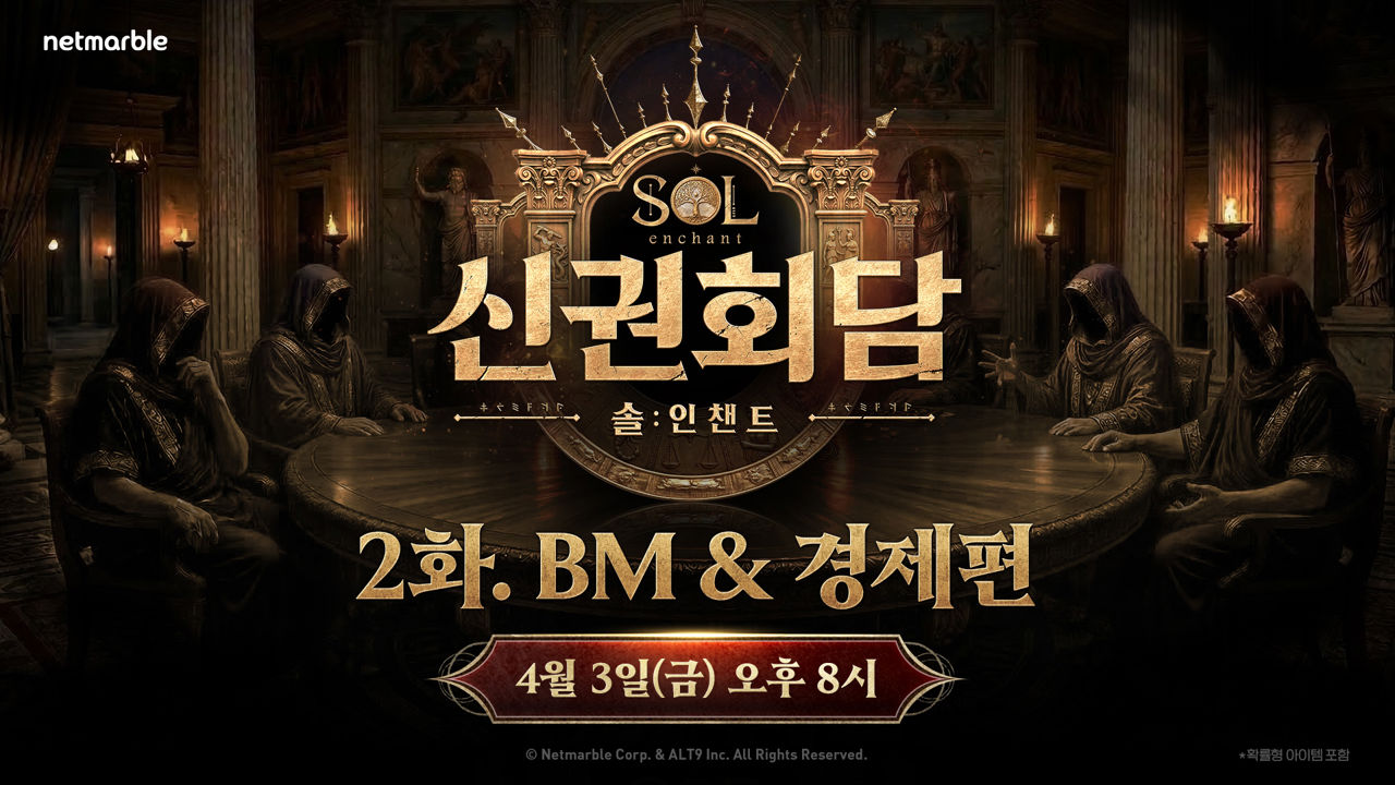 지난 3/19 '신권회담 1화'에 이어 진행하는 '신권회담 2화'는 <SOL: enchant>의 상반기 정식 출시를 앞두고 선보이는 이용자 라이브 소통 콘텐츠로, 이번 라이브 방송 2화에서는 BM·경제 카테고리와 특별 보상 등을 중심으로 소통이 진행될 예정이다.