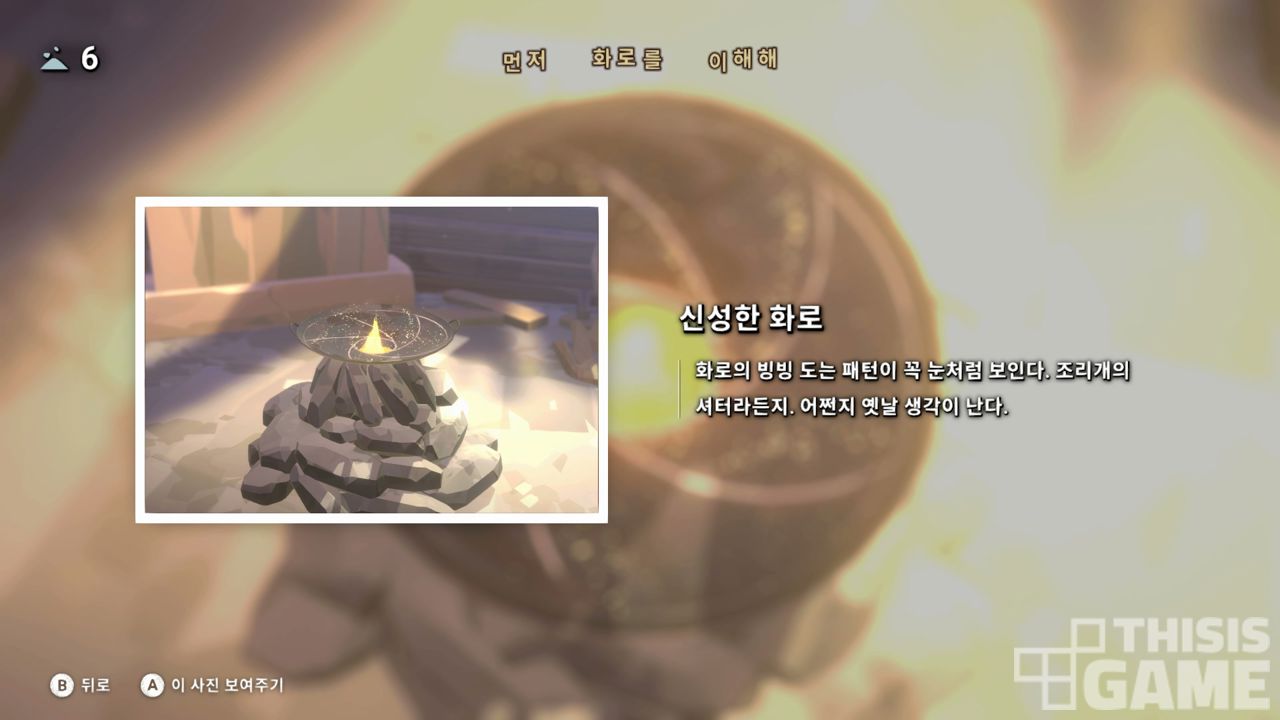 뿐만 아니라 이 게임에서는 카메라를 통해 풀어나가야 할 것도 정말 많다. 화로에서 진행할 수 있는 토템의 수수께끼, 의문의 상형 문자 해독, 동물 친구의 정체 밝히기, 석판에 그려진 벽화 등 사진을 통해 밝혀낼 것들이 꽤 많다.