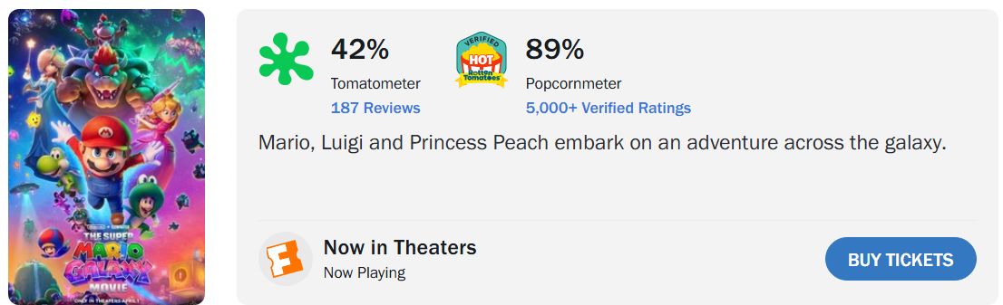 한편, <슈퍼 마리오 갤럭시>에 대한 관객과 평단의 평가는 대조적인 모습을 보이고 있다. 4월 8일 기준 로튼 토마토에서 관객 점수(팝콘미터)는 89%를 기록했지만, 평론가 점수(토마토미터)는 42%에 그쳤다. 메타크리틱에서도 유저 점수는 7.8점인 반면 메타스코어는 37점이다.