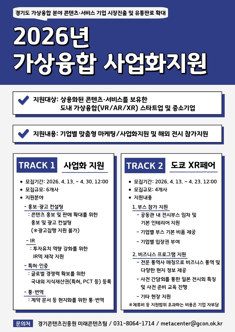 경기콘텐츠진흥원(원장 탁용석, 이하 경콘진)은 도내 가상 융합 스타트업의 시장 진출 및 유통 판로 확대를 지원하는 <가상 융합 사업화 지원> 사업에 참여할 10개 사를 모집한다. 올해 사업은 ▲트랙 1(마케팅·사업화 지원) ▲트랙 2(도쿄 XR 페어 참가 지원)로 나누어 진행하며 '트랙 1'은 4월 30일까지, '트랙 2'은 4월 23일까지 신청할 수 있다.