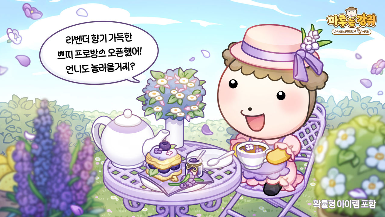 가장 먼저 눈에 띄는 변화는 신규 테마 '쁘띠프로방스'다. 라벤더 향기가 느껴지는 프로방스 감성의 디자인으로, 보랏빛 색감과 꽃모자 코스튬이 특징이다. 테마 업데이트와 함께 '향기 폴폴 라벤더 블랙티', '콕콕 블루베리 스콘' 등 시즌 메뉴 2종도 출시된다. 또한 테마와 연계된 퀘스트는 1차, 2차, 3차로 순차 오픈되며, 최종 단계 완료 시 한정판 인테리어 아이템을 획득할 수 있다.