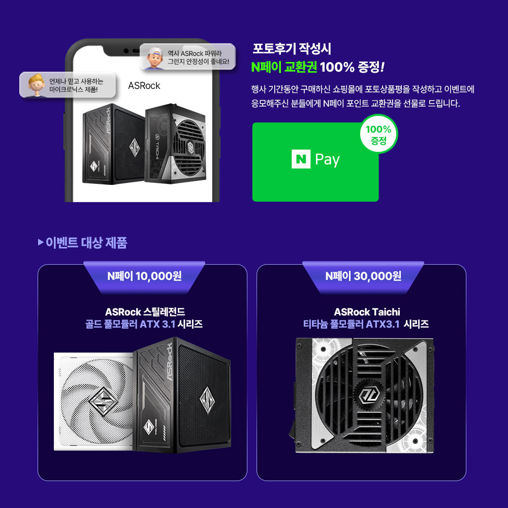 또한 포토 상품평을 작성한 고객에게는 네이버페이 포인트 교환권이 추가 증정된다. 스틸레전드 골드 풀모듈러 ATX 3.1 시리즈 구매 시 1만 원, 타이치 티타늄 풀모듈러 ATX 3.1 시리즈 구매 시 3만 원 상당의 혜택이 제공된다.