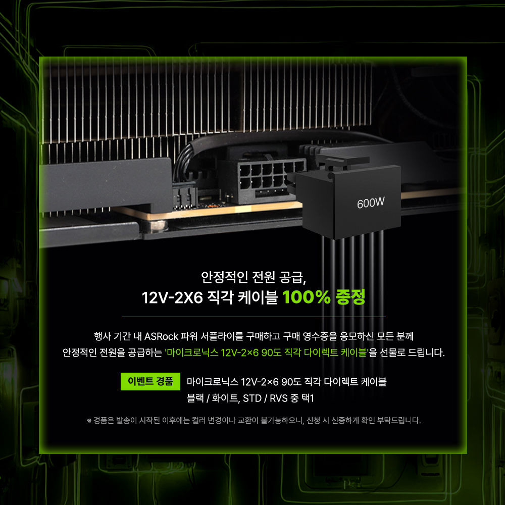 이벤트 참여 고객 전원에게는 차세대 그래픽카드 환경에 대응하는 '12V-2x6 90도 직각 다이렉트 케이블'이 증정된다. 해당 케이블은 최대 600W 전력 공급을 지원하며, 시스템 내부 공간 활용과 케이블 정리에 유리한 구조로 설계됐다. 블랙과 화이트 색상, STD 및 RVS 타입으로 제공된다.
