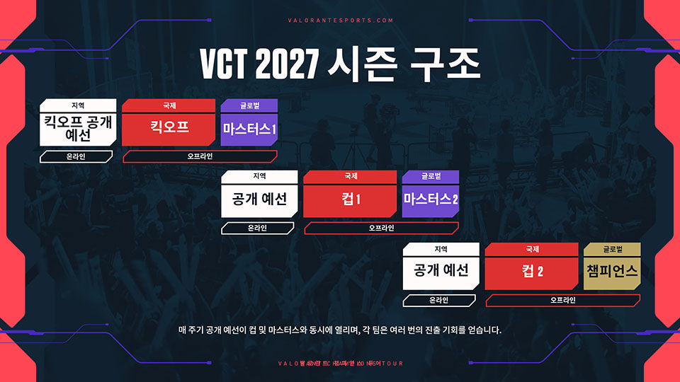 2027년부터 발로란트 챔피언스 투어(VCT)는 전 세계 모든 팀에게 글로벌 무대로 향하는 문을 개방해 더욱 역동적인 발로란트 이스포츠 생태계로 거듭난다.