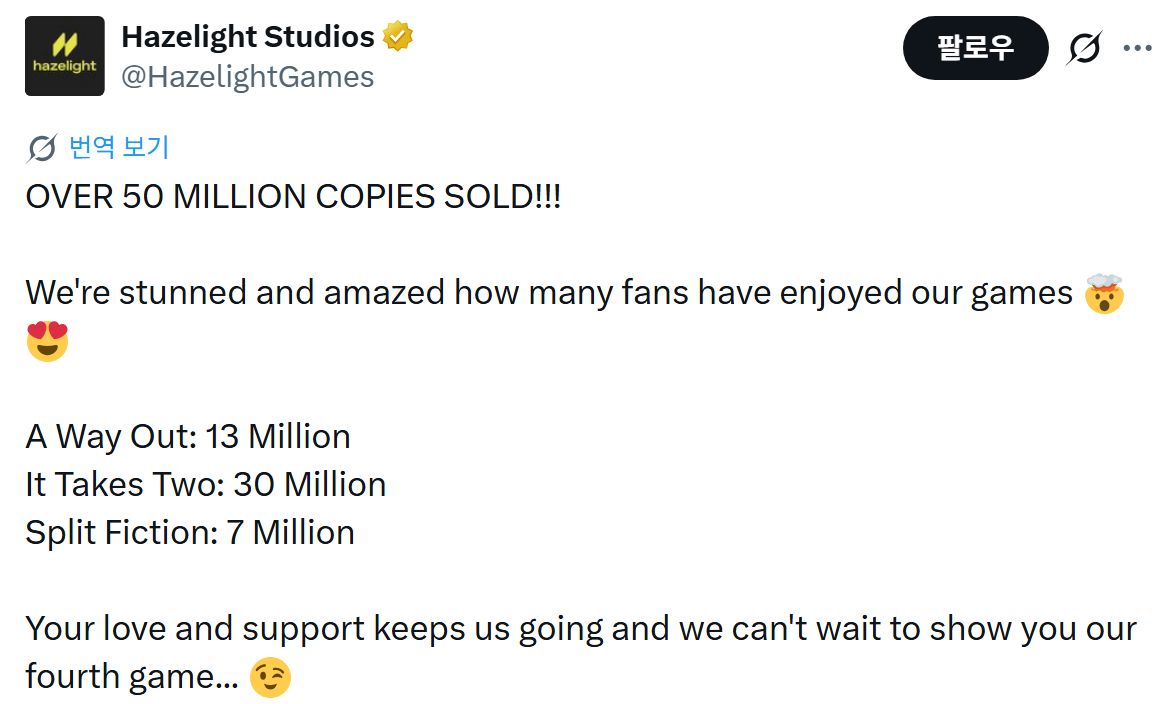 스튜디오 측은 게임별 판매량도 함께 공개했는데, 2018년 출시된 <어 웨이 아웃>이 1,300만 장, 2021년 출시된 <잇 테익스 투(It Takes Two)>가 3,000만 장, 2025년 출시된 <스플릿 픽션>이 700만 장이다.