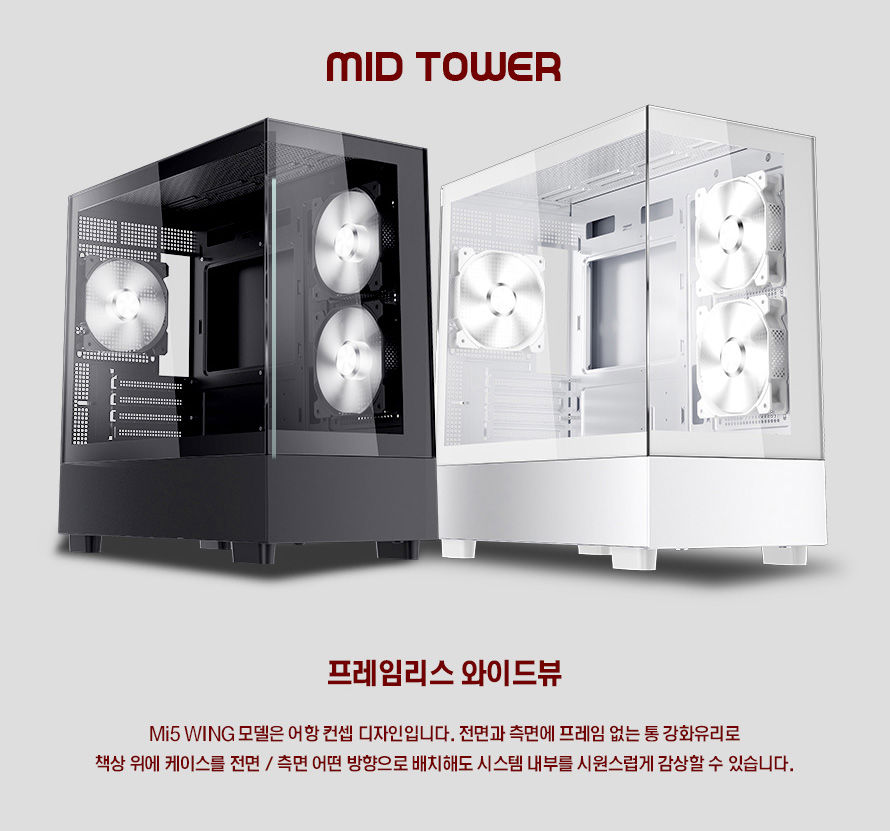 1stPlayer Mi5 WING는 전면과 좌측면이 프레임리스 강화유리 패널로 구성되어, 최근 유행인 '어항형' 케이스에 디자인을 가지고 있으며, 책상 위 전면 또는 측면으로 배치하더라도 내부에 장착된 하드웨어의 LED 및 시스템 팬들의 LED을 온전히 감상할 수 있다. 1stPlayer Mi5 에서 쿨링 성능 부분이 업그레이드 되어 측면에 역방향 흡기용 120mm 화이트 L:ED 팬이 2개가 장착되어, 케이스 내부에 차가운 공기 유입을 도와주며, 후면 배기용 120mm 화이트 LED 팬 1개가 장착되어, 뜨거운 내부 열기를 빠르게 외부로 배출해준다.