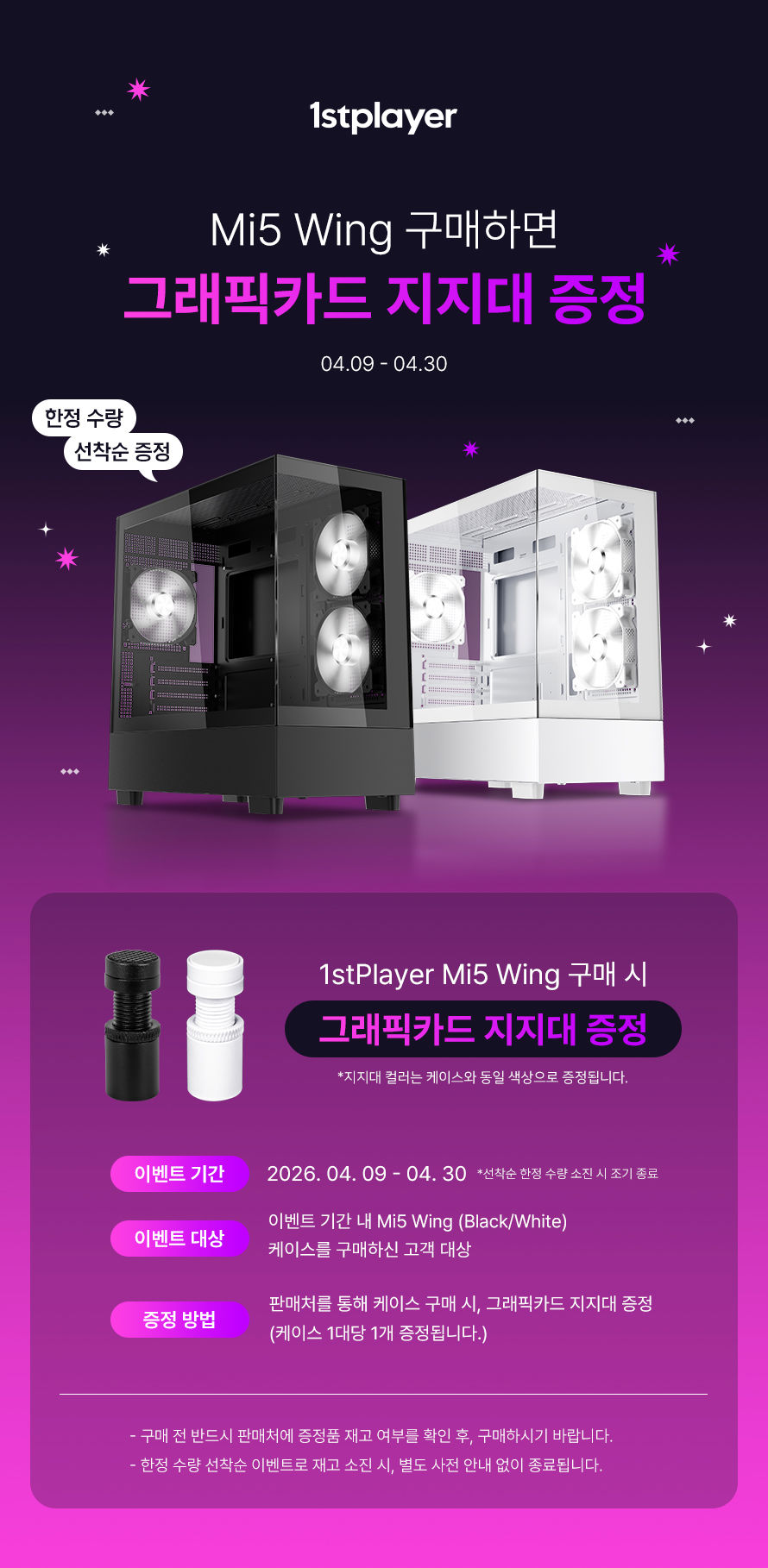 시소닉(Seasonic), 맥스엘리트(MAXELITE) 파워서플라이, 퍼스트플레이어(1stPlayer) 케이스, 할른지예(Halnziye) 써멀 컴파운드, 업히어(upHere) CPU 쿨러 등을 국내 시장에 공급하는 맥스엘리트는 2026년 4월 9일부터 4월 30일까지 1stPlayer Mi5 WING 블랙, 화이트 케이스 구매 고객 대상으로 그래픽카드 지지대 증정 이벤트를 진행한다고 밝혔다.
