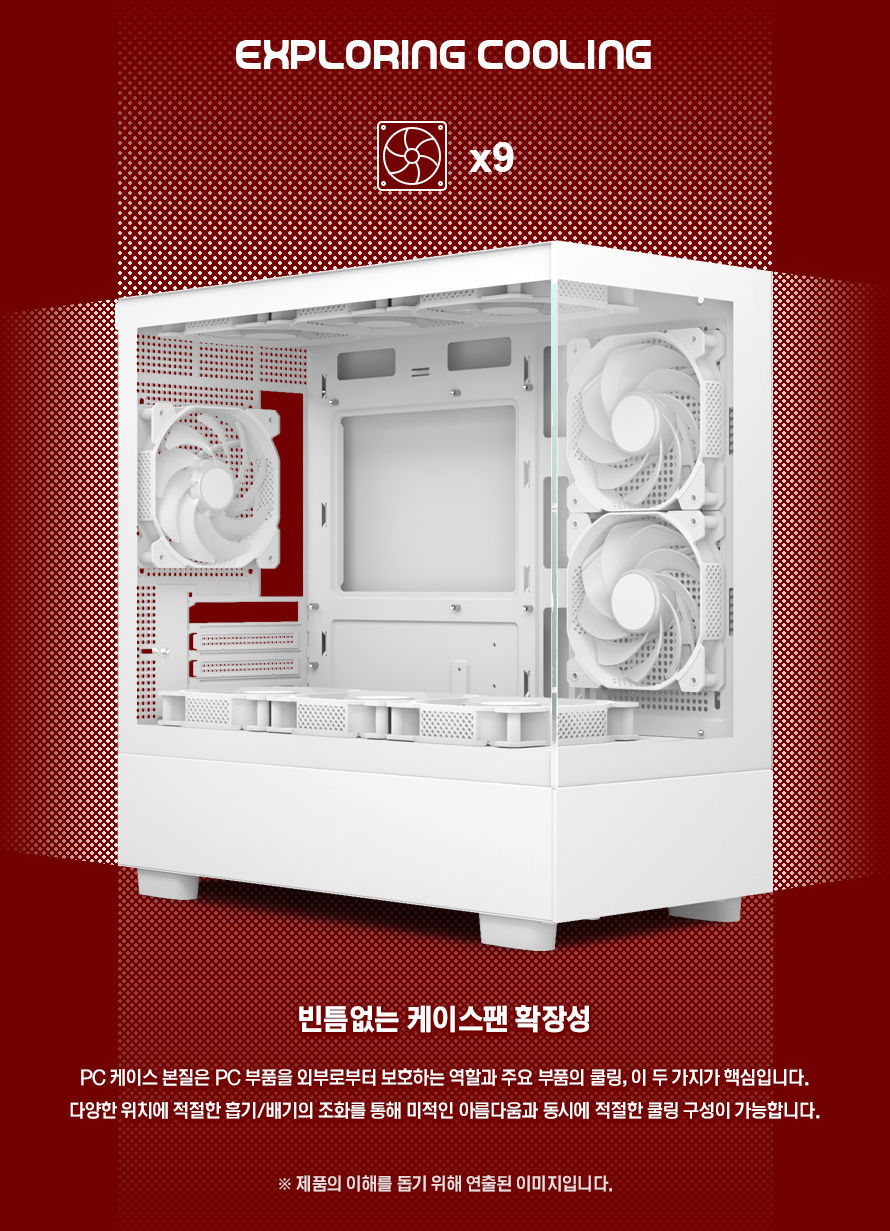 케이스 반대쪽 측면, 메탈 패널에는 측면 흡기를 돕기 위한 에어홀이 위치하고 있으며, 후면 또한 120mm 팬 공간 외에도 후면 상단, 측면, PCI 슬롯 커버 모든 부분이 타공형 에어홀로 설계되어, 시스템 내부 공기 순환을 돕는다. 기본 구성 120mm팬 3개를 제외하고 추가로 상단 120mm팬 최대 3개, 내부 파워가이드 상단에도 120mm 팬 3개 장착이 가능해, 총 최대 9개의 120mm 팬까지 설치가 가능하여(기본 구성 제외 시, 6개 추가 장착 가능), 미니타워형 케이스임에도 불구하고, 360mm 수냉 라디에이터를 지원하여, 하이엔드 시스템을 구성하기에도 안성맞춤이다.