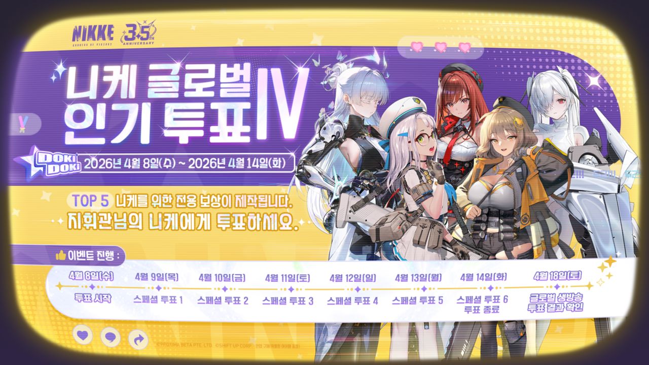 '승리의 여신: 니케' 3.5주년 기념 특별 방송이 오는 4월 18일 토요일 오후 7시, 공식 유튜브 채널을 통해 중계될 예정이다. 또한 4월 8일부터 14일까지 매년 뜨거운 관심을 받아온 대표 커뮤니티 이벤트 '두근두근! 니케 글로벌 인기 투표 Ⅳ'도 진행된다. 인기 투표의 결과는 3.5주년 기념 특별 방송에서 공개될 예정으로 게임 커뮤니티는 많은 지휘관들의 기대감 속 뜨거운 분위기가 이어지고 있다.