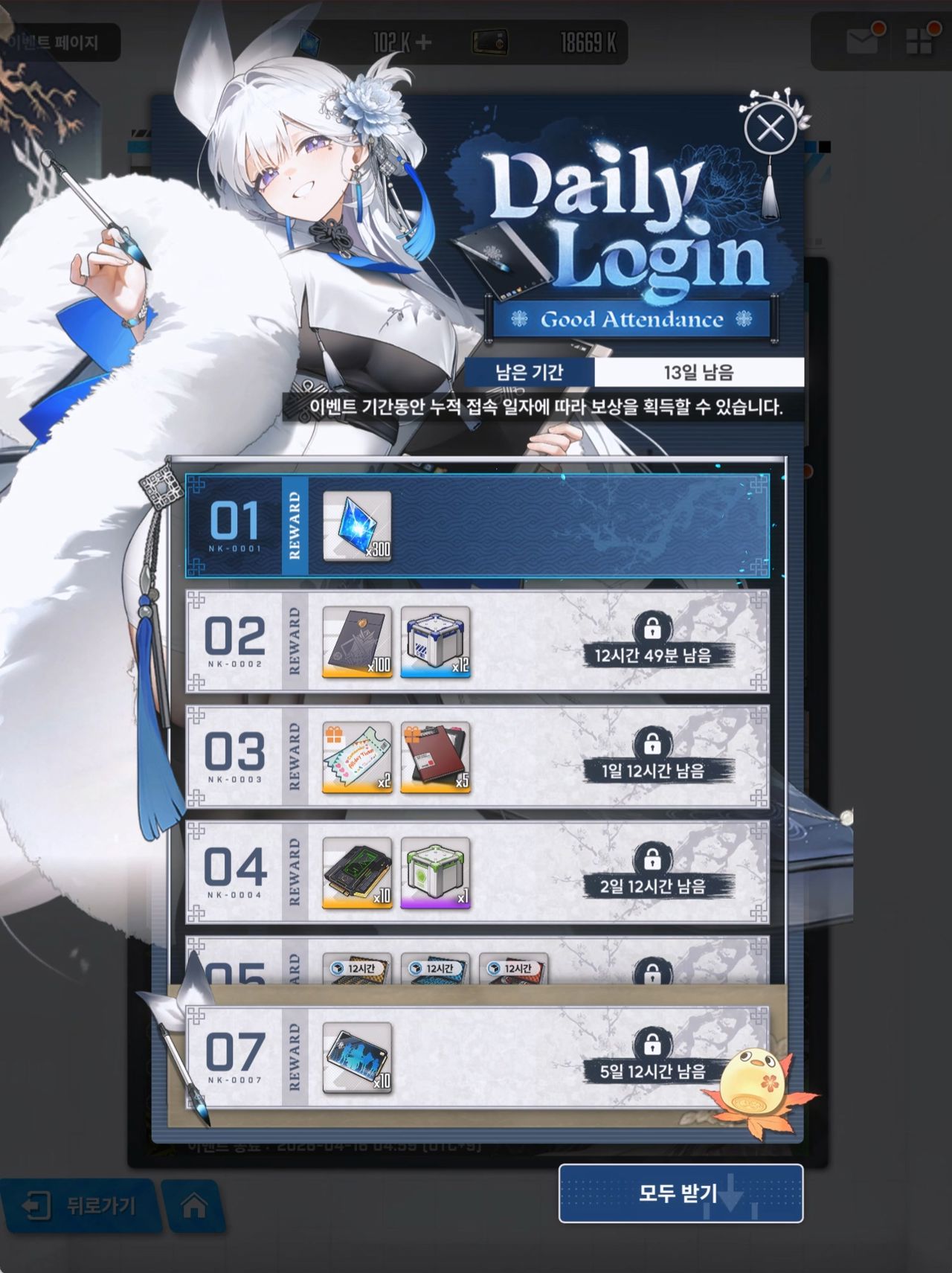 출석 이벤트 기간 동안 매일 게임에 접속하면 최대 7일까지 보상을 획득할 수 있다. 7일 누적 로그인 달성 시 모집 티켓과 육성 재화가 포함된 모든 보상을 얻을 수 있다.