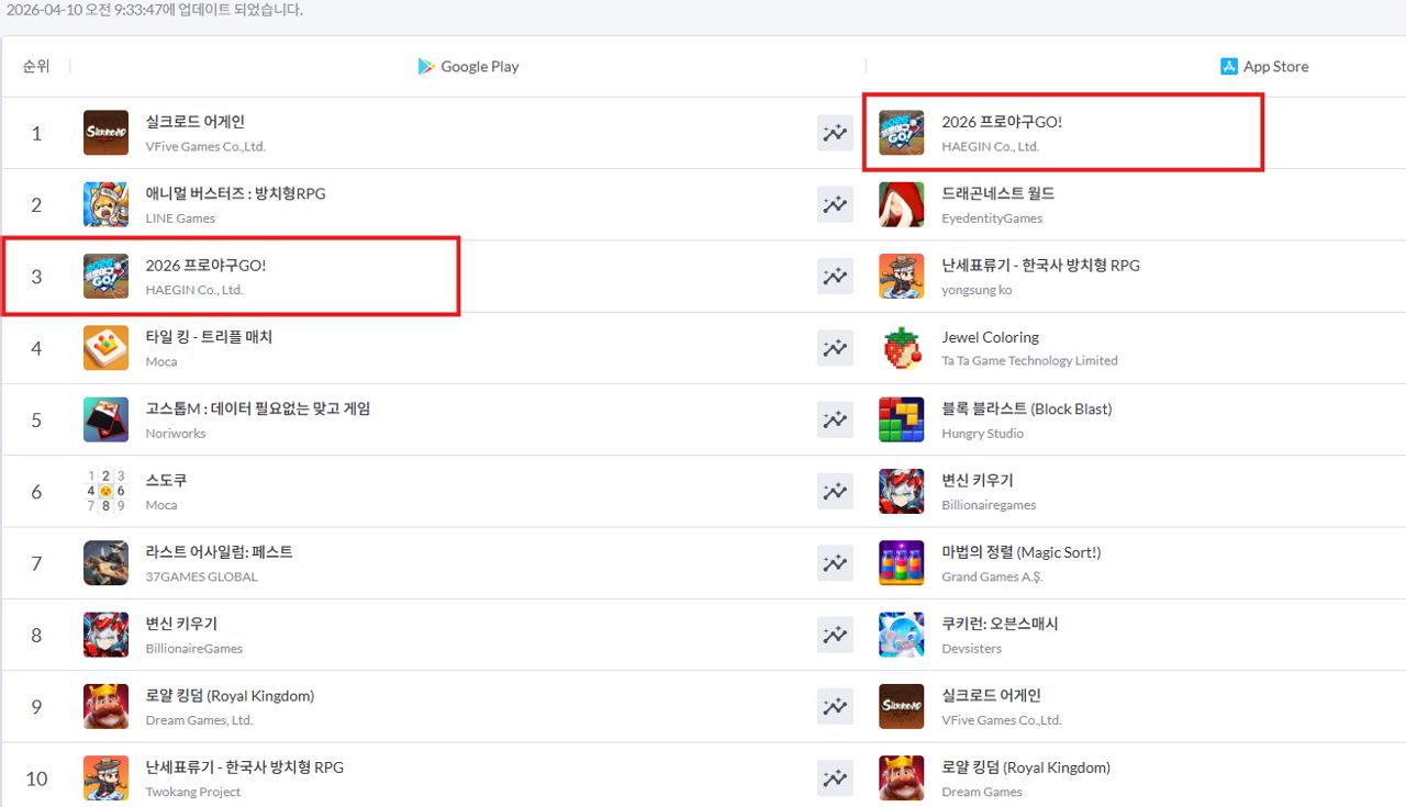 해긴은 자사가 개발하고 서비스하는 모바일 방치형 야구 게임 <2026 프로야구GO!>가 애플 앱스토어 인기 순위 1위를 기록하고, 구글 플레이스토어에서도 상위권에 안착하며 본격적인 흥행 가도에 올랐다고 밝혔다.