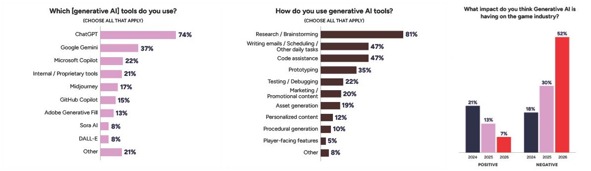 이러한 기술적, 윤리적 한계는 실제 게임 산업 종사자들의 불안감으로 이어지고 있다. 깁슨 총괄은 최근 게임 개발자 회의(GDC)에서 발표된 산업 현황 보고서의 통계를 인용하며 오늘날 게임 업계가 직면한 모순적인 상황을 설명했다.