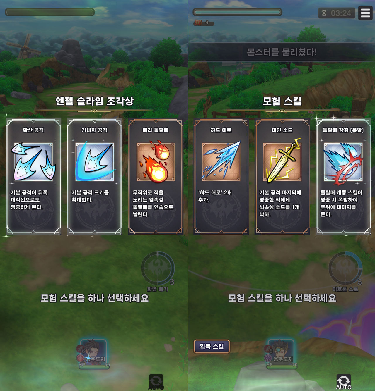 불을 던지는 '메라 돌팔매'나 플레이어 주변에 맴도는 공격 등 일부 로그라이크 스킬은 '멈춰 있지 않은' 동안에도 공격을 이어갈 수 있게 해준다.