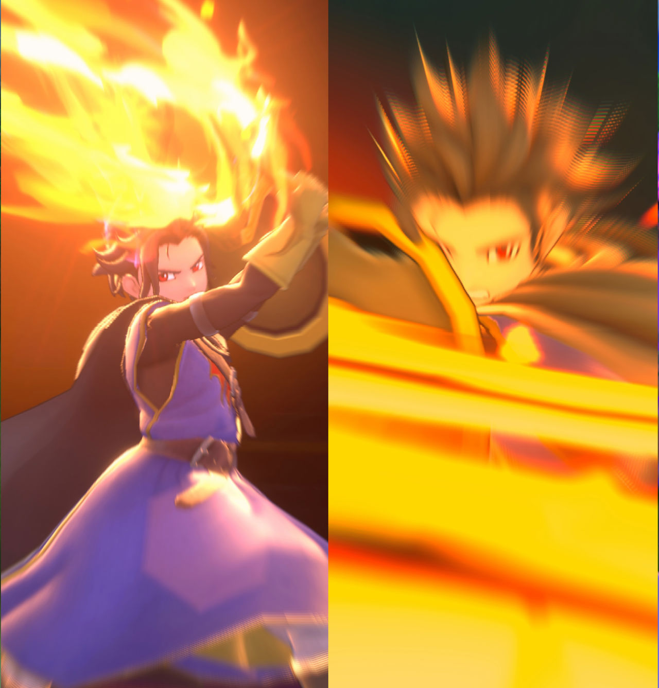 위에 보이는 장면은 화염 속성의 검을 쓸 때의 필살기 연출이다. '무기'마다 필살기나 기본 공격이 다른 것을 먼저 주목할 필요가 있다.