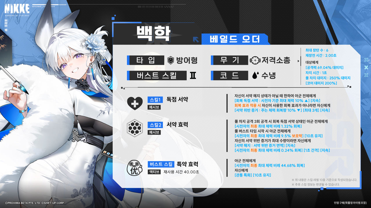 백학은 수냉 코드의 저격소총 무기를 사용하는 2버스트 '방어형' 니케다. 통상 캐릭터로, 이번 픽업이 끝난 이후에도 이후 일반 뽑기에서 등장할 예정으로, 종합적으로 성능을 평가하면 딱 '통상 니케' 스럽다고 할 수 있다.