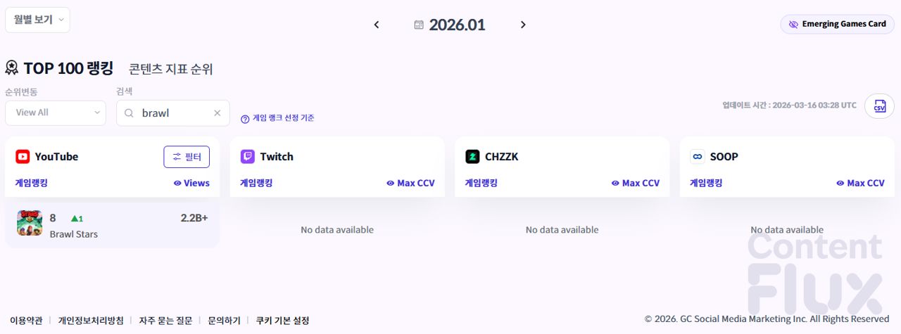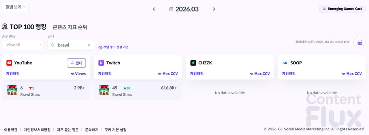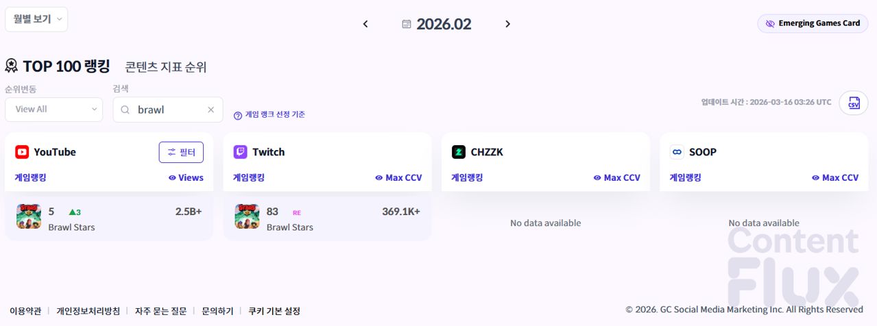 ▶ 2026년 3월 누적 조회수 및 누적 최고 동시 시청자 수 기준 <브롤스타즈> 순위.