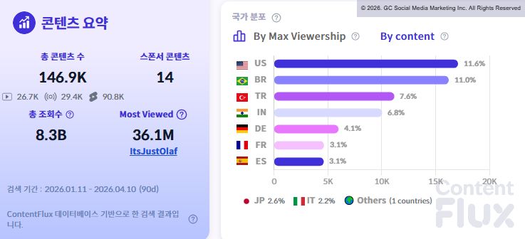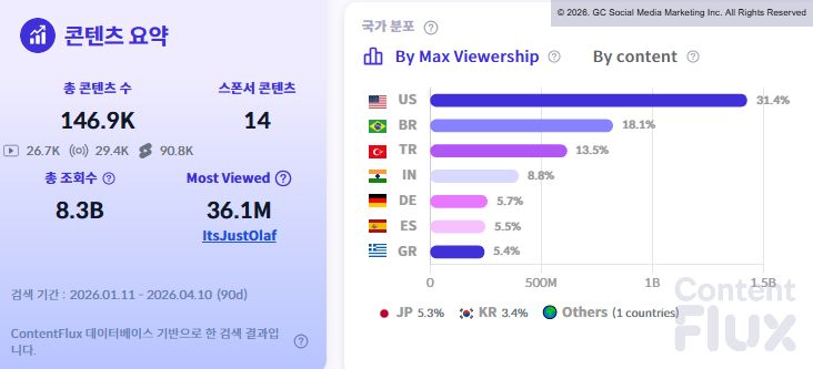글로벌 시청자 분포를 살펴보면 2026년 4월 10일 기준 최근 3개월간 유튜브 조회수 비중은 미국(31.4%)이 가장 높았으며 브라질(18.1%), 터키(13.5%), 인도(8.8%) 순으로 나타났습니다.