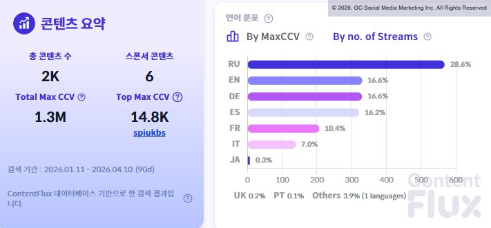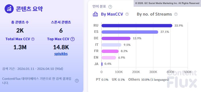 트위치 플랫폼의 언어별 데이터에서는 러시아어와 스페인어의 비중이 높게 나타났습니다. 최고 동시 시청자 수 기준 러시아어(33.9%)와 스페인어(27.1%)가 전체의 과반 이상을 점유했습니다.