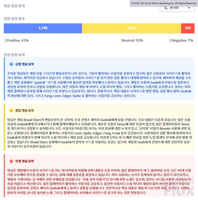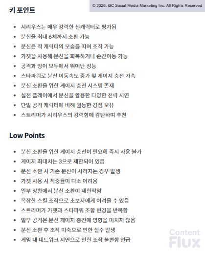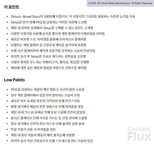 ▶ ContentFlux AI가 요약한 GoDeiK의 <브롤스타즈> 영상 내용.