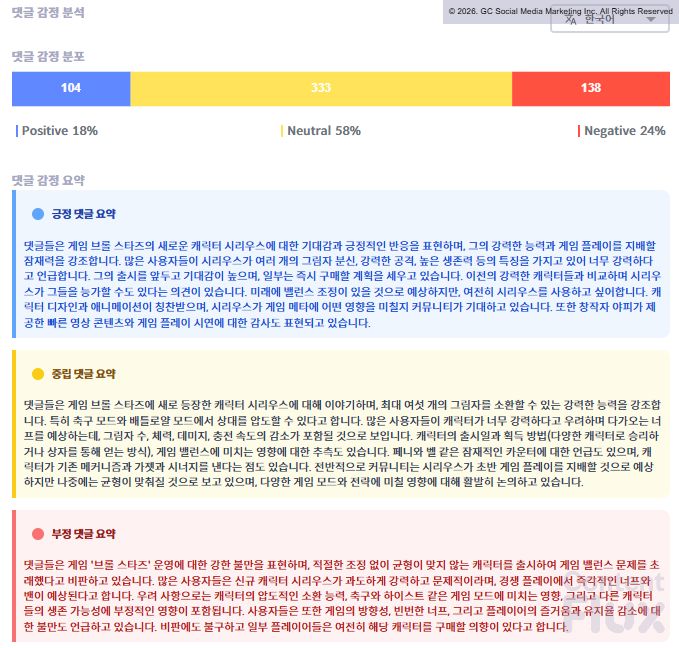 해당 영상의 긍정 여론은 41%로 앞선 사례보다 높게 집계되었으나, 이는 당시 진행 중이던 시리우스 증정 이벤트의 참여 댓글이 지표에 반영된 결과로 분석됩니다.