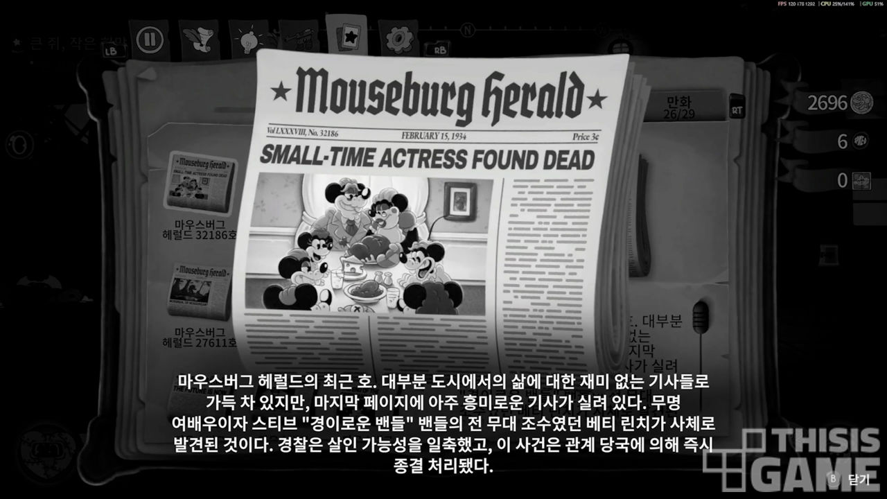 <마우스>는 러버 호스 미학을 현대적인 액션 게임으로 영리하게 재해석한 수작입니다. 화제성만 노리는 어둠의 미키 마우스나 <컵헤드>의 1인칭 버전에 그쳤을 수도 있을 아이디어를 재치 있는 연출과 호쾌한 타격감, 탄탄한 레벨 디자인으로 견고히 완성했습니다.